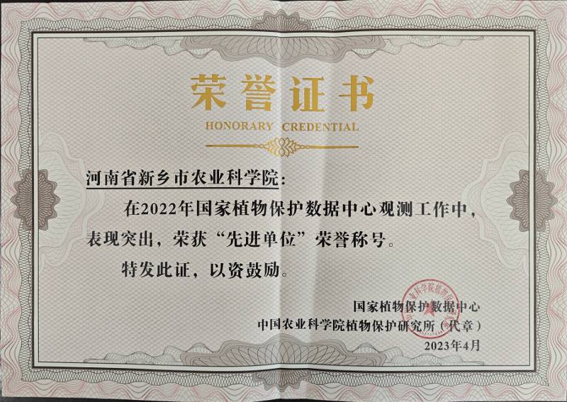 我院植物保护研究所承担小麦白粉病、小麦蚜虫、玉米螟、草地贪夜蛾4项国家植物保护基础性长期性科技观测监测任务。在2022年科技观测监测工作中,院植物保护研究所主动作为、克服困难,按要求及时开展4项病虫害观测监测工作,按要求完成数据记录、统计、上传等工作。在2022年国家植物保护数据中心观测工作中,我院被国家植物保护数据中心、中国农业科学院植物保护研究所授予“先进单位”荣誉称号,郭振营同志获得“先进个人”荣誉称号。